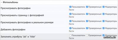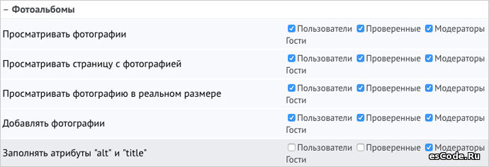 В настройка прав групп появилась возможность отключить поля атрибутов ALT и TITLE в модуле "Фотоальбомы" для определенных групп.